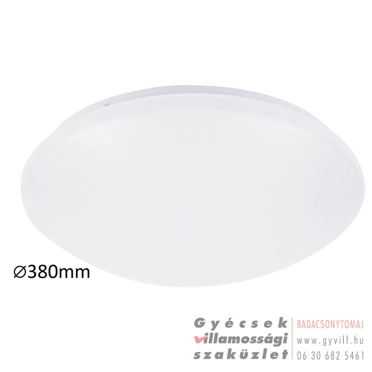 Időtlen megjelenésű mennyezeti lámpa beépített energiatakarékos LED fényforrással. 38 cm átmérőjű, fém ház és fehér színű műanyag lámpabúra. A beépített LED fényforrás 24W teljesítmény mellett 1800 lumenes fényerőt, valamint 4000 Kelvines, természetes fehér színű fényt biztosít. 5 év garanciával! 5 év garanciával. A lámpatestben a fényforrás nem cserélhető!